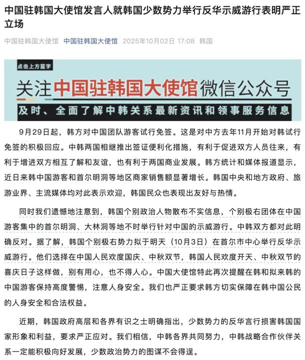 据了解,韩国个别极右势力拟于明天(10月3日)在首尔市中心举行反华示威游行。他们选择在中国人民欢度国庆、中秋双节,韩国人民欢度开天、中秋双节的喜庆日子这样做,别有用心,也不得人心。中国大使馆特此再次提醒在韩和拟来韩的中国游客保持高度警惕,注意人身安全。我们也严正要求韩方切实保障在韩中国公民的人身安全和合法权益。