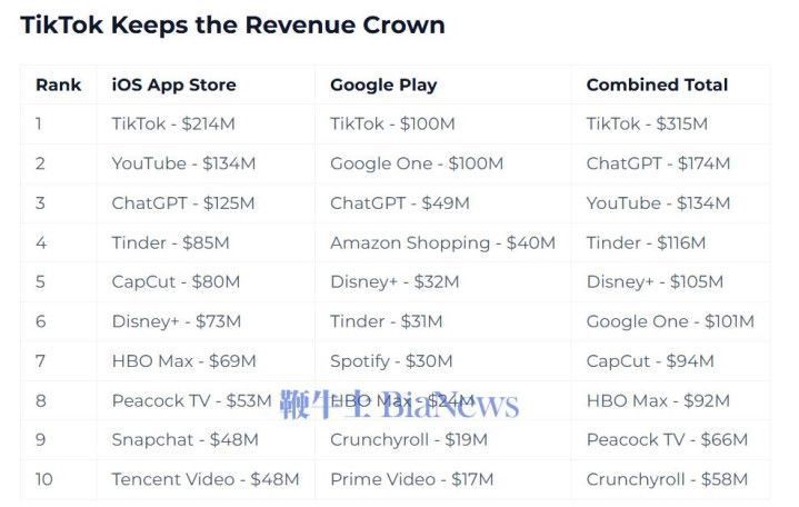 YouTube、Tinder和Disney+占据了前五名的其余位置。随着人们重返工作和学习,这三家公司的营收均有所下滑,这是9月份的典型趋势。不过,对于一个发展较为缓慢的月份来说,它们的总营收依然保持稳健。CapCut的营收也小幅上升,总收入约为9400万美元。它正悄然成为TikTok产品系列中一个可靠的盈利点。