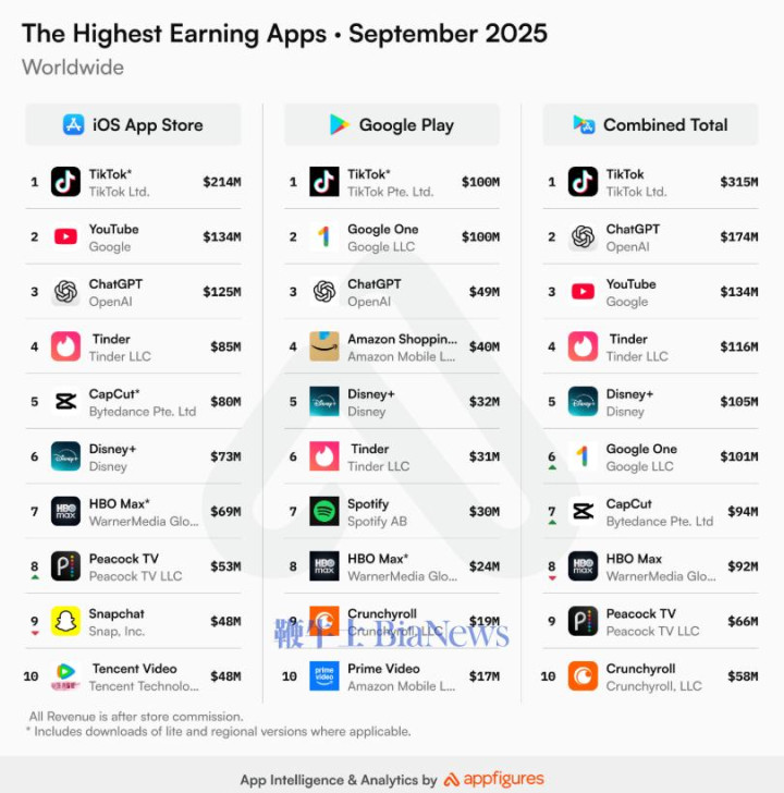 ChatGPT紧随其后,预计净收入为1.74亿美元。这一数字略高于8月份,表明对高级AI服务的需求并未减弱。稳步增长也表明,随着OpenAI进一步推进GPT-5和企业级功能,其能够持续吸引用户的兴趣。