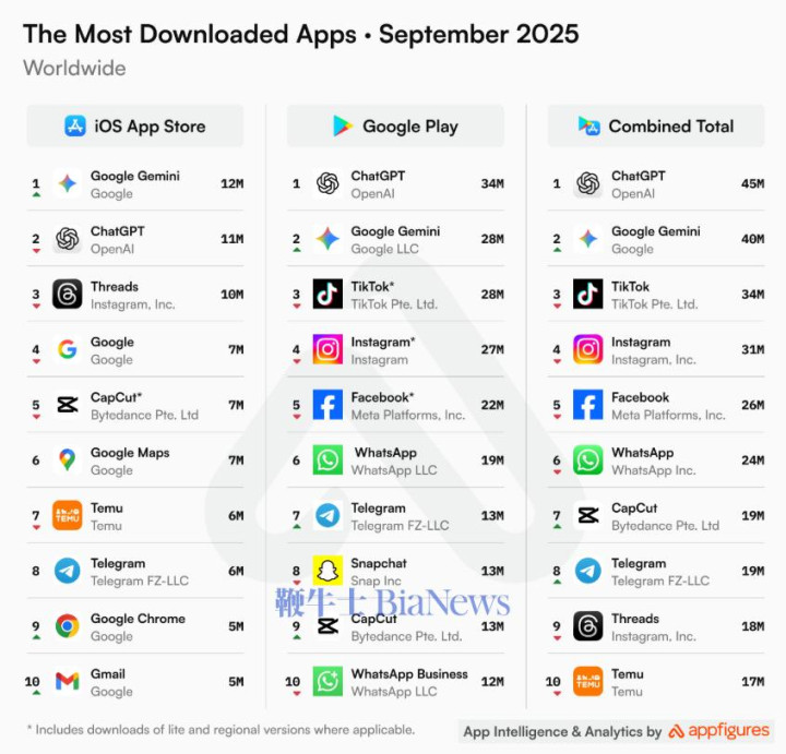 Appfigures数据显示,ChatGPT9月份全球新增安装量约为4500万次。这一数字较8月份略有下降,但仍远超两家商店的其他所有应用。